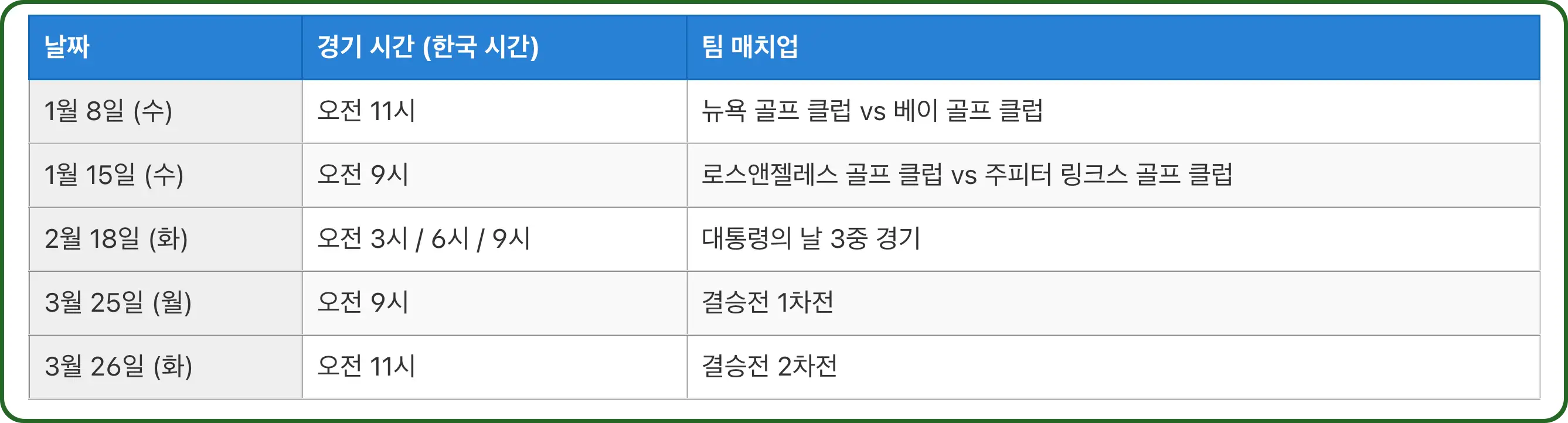 TGL 골프 리그는 2025년 1월 8일에 개막해 3월 26일까지(한국 시간) 진행됩니다. 이 표는 주요 경기 일정입니다. 세부 경기 일정도 따로 확인하실 수 있습니다. 정규 시즌 동안 매주 경기가 열리며, 이후 준결승과 결승으로 이어집니다.